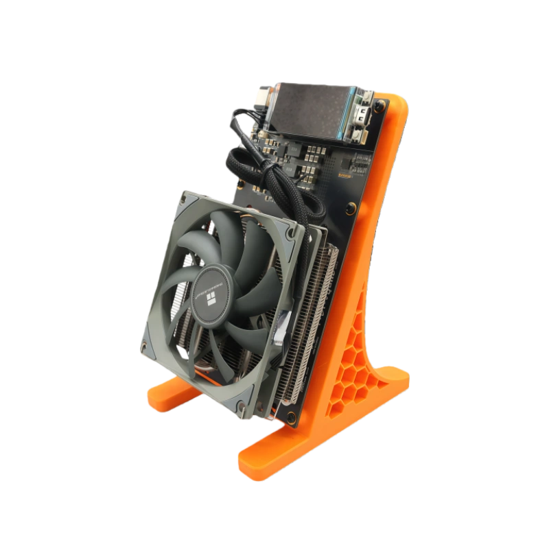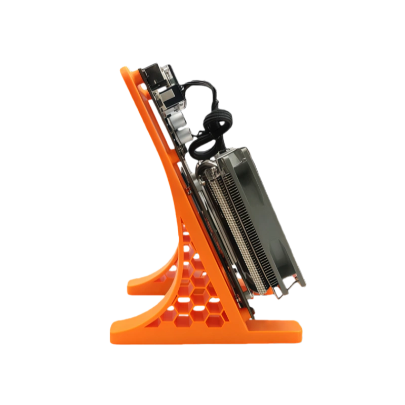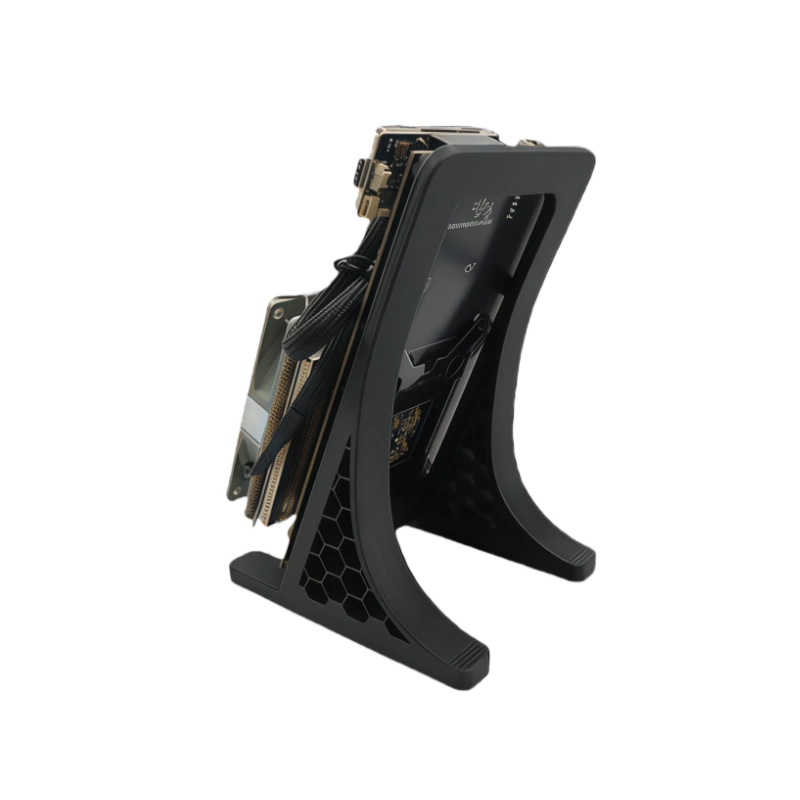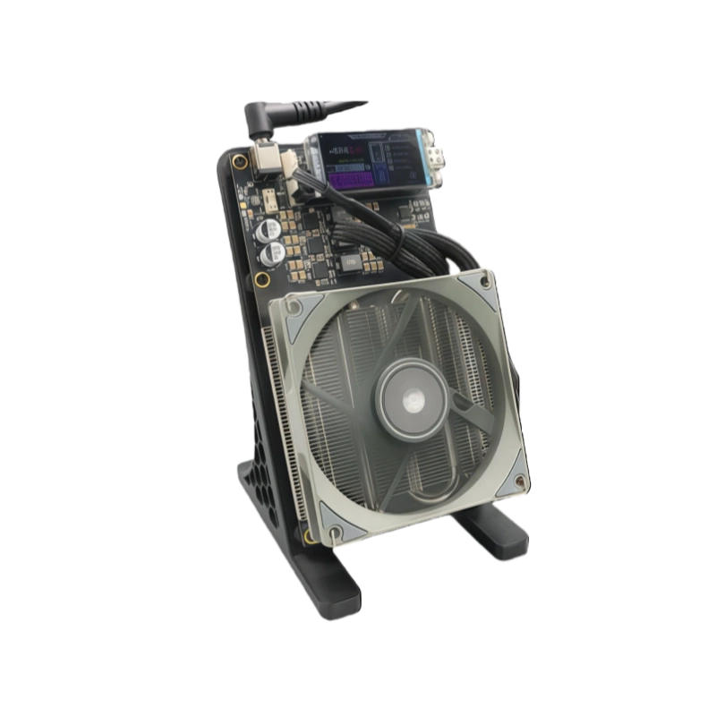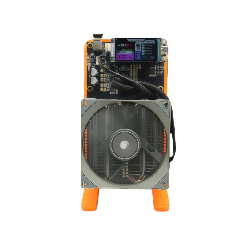 The NerdMiner NerdQaxe++ 4.8T is distinguished by its compact size, lightweight design, low power consumption, excellent energy efficiency, reduced noise level, and efficient cooling via a single high-speed fan.